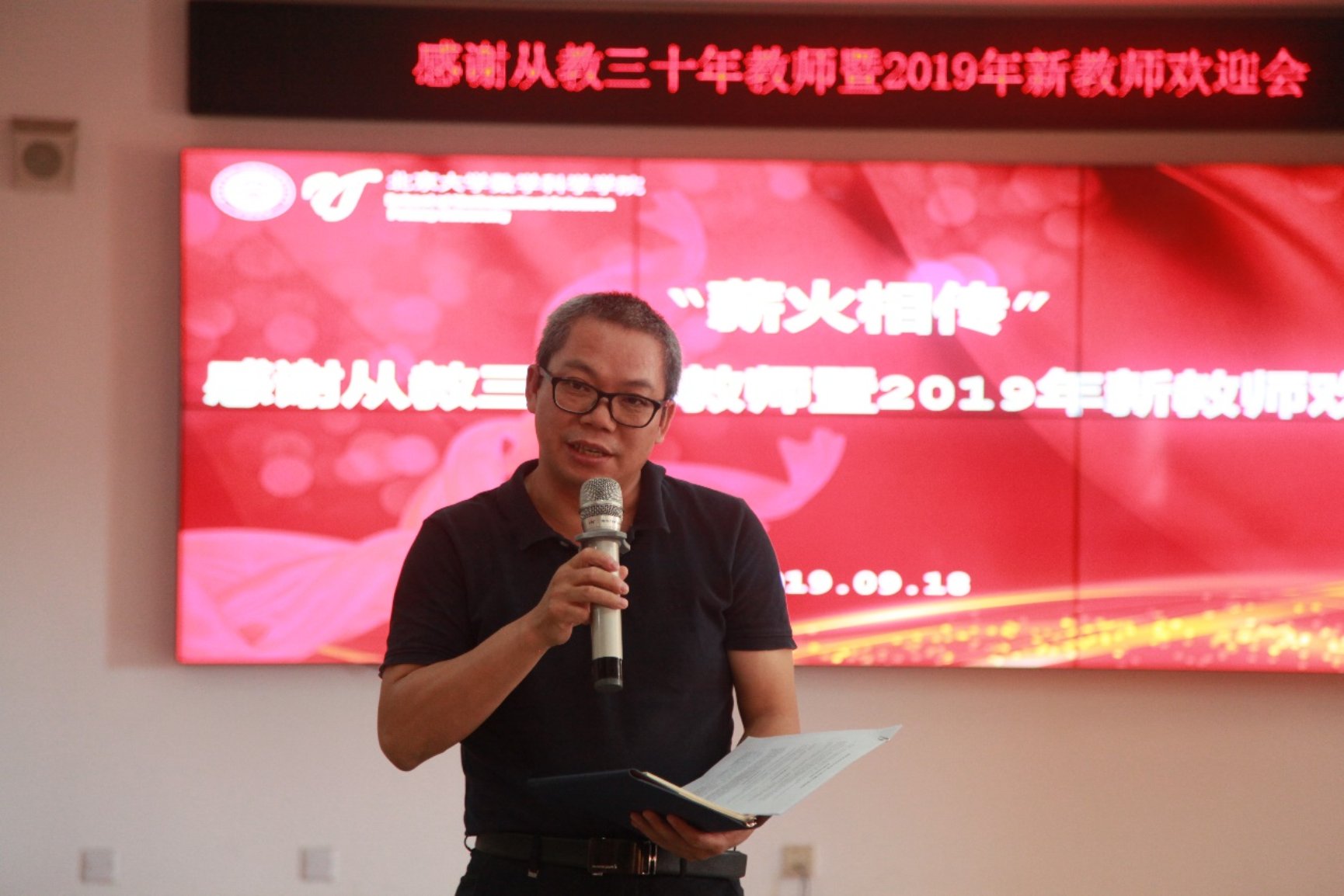 孙赵君在活动伊始表达了对从教三十年教师的感激之情,同时也对新入职教职工表示热烈欢迎。他说今天一个主题承载两件事情,表达了薪火相传的美好寓意,希望新教师们传承老教师们的风范,助力北大数学学科继续前进。