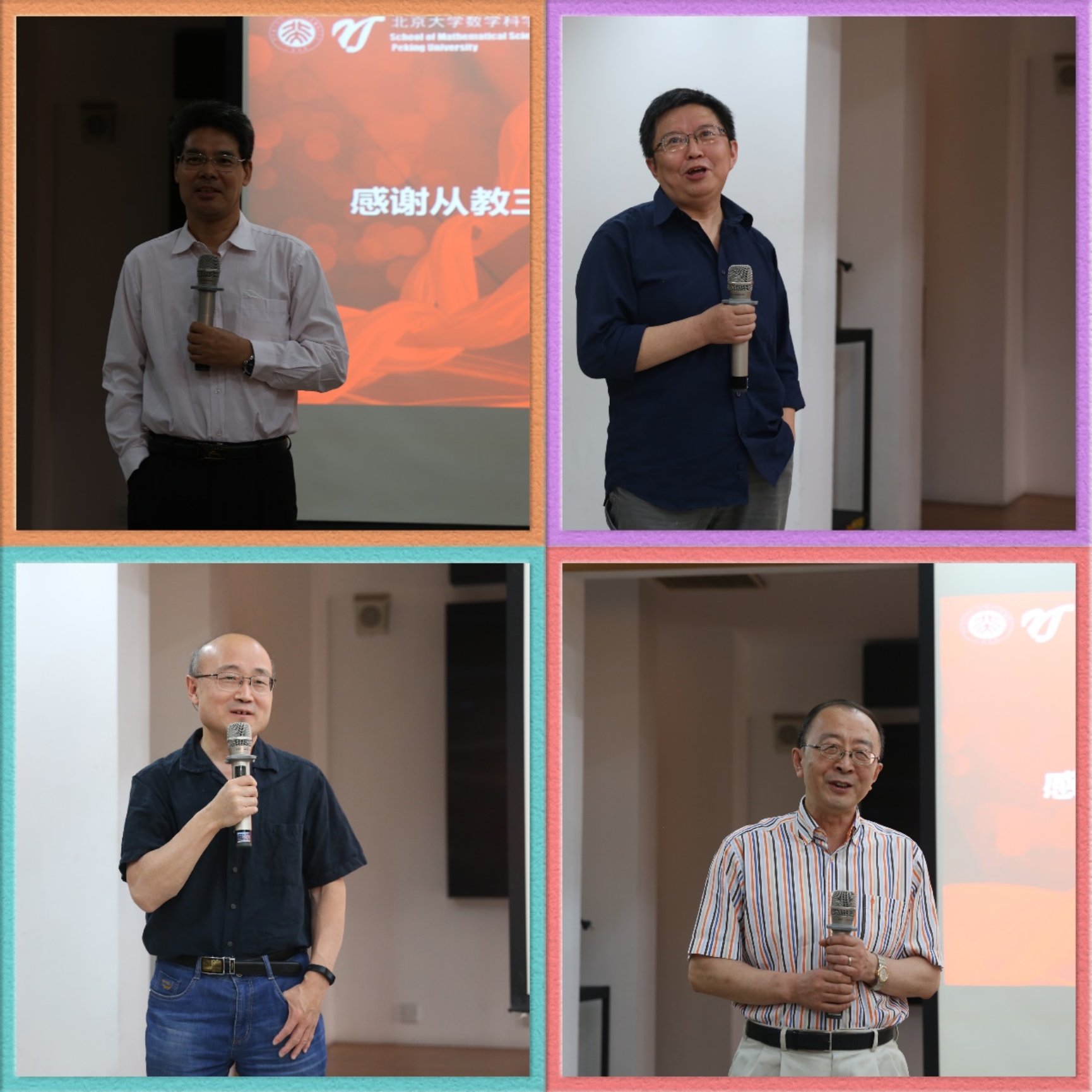 从教三十年的教师分别发表了个人感想和期望。柳彬老师提及看了学生的祝福视频,看到视频里自己年轻的模样,感慨起时光飞逝,表达了未来至少5年内继续奋斗在教学第一线的决心。李东风老师提及未意识到自己就已经工作了30年,非常感谢北京大学这个平台,是北大培养了他并给予了他非常多的机会,他深切地表达了对北京大学、领导、前辈老师的感谢之情。他谈及教学感悟,希望年轻的教师们能够多吸收国际上的教学经验,取长补短,以便更好地激发学生的好奇心以及学习劲头,为教学做出更多的成绩,培养更多一流的人才,为北大的双一流建设做贡献。田青春老师回忆起这三十年的峥嵘岁月——三十功名尘与土,八千里路云和月,表达了对丁先生的知遇之恩,让他能够在北大的舞台上拥有丰富的经历,他讲述了他给后辈写“爱自己,爱家人,爱单位,爱工作,爱集体”的心路历程,眉眼间流露出对后辈满满的希翼。王冠香老师回忆起弹指一挥间的岁月,表达了对至尊国际