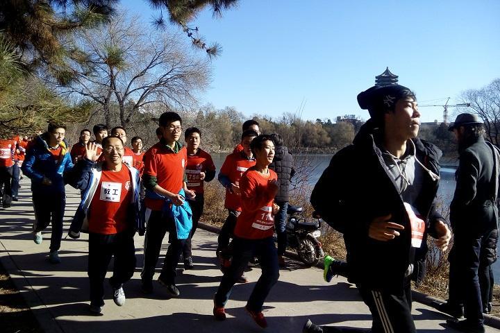 初冬的北京,一扫前几日的阴霾。蔚蓝的天空万里无云,明媚的阳光普照大地。良好的天气条件十分适合户外长跑运动。发令枪一响,教工队伍跟在学生队伍后开始了这段三公里的冬征。慵懒的未名湖畔,积雪尚未完全消融。三三两两悠闲漫步的游人身边,突然冒出了一群疾行的跑者。他们争先恐后,互不相让。激昂的步伐和矫健的身姿与静谧的一湾未名碧水相映成趣。3公里的旅途转瞬即逝,参赛的教工既锻炼了身体,也饱览了燕园冬日美景。