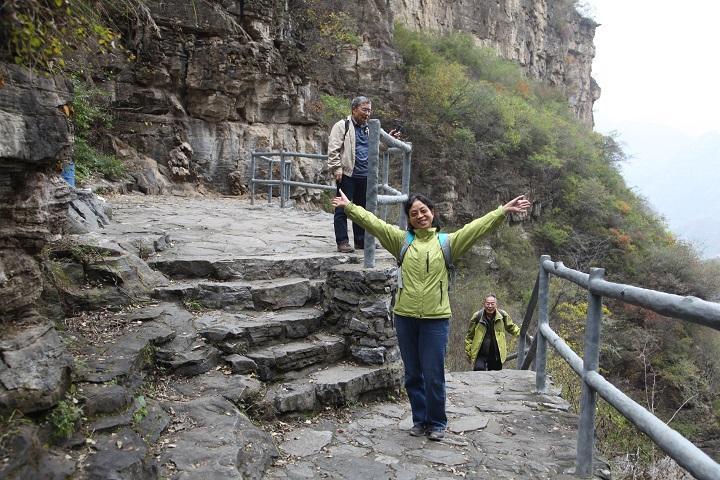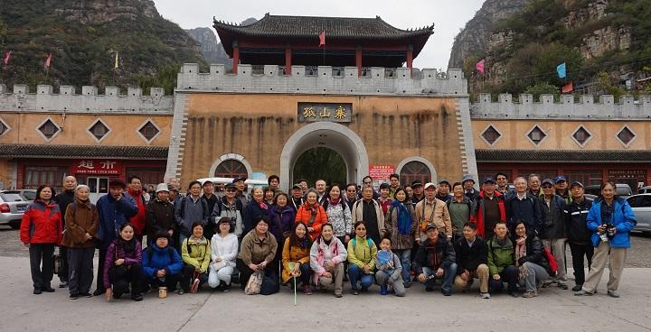 几场雨水过后的北京,凉风习习,秋意盎然。在蜿蜒的十渡山谷蛇行一番后,大巴停靠在景区门前。诸多老师久未谋面,彼此嘘寒问暖,谈笑风生。经浮桥穿过山前宽阔的河面,便是孤山寨的寨门。老师们按捺不住心中的激动,在寨门前合影留念。大家舍弃了电瓶车,步行前往谷中景点。一路上遍是挂满大柿子的丰收树,令人也不禁感受这秋日的喜悦。