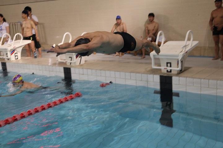 周蜀林老师在男子C组50米蛙泳比赛中起跳