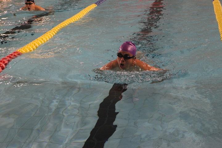 谭小江老师在男子D组100米蛙泳比赛中