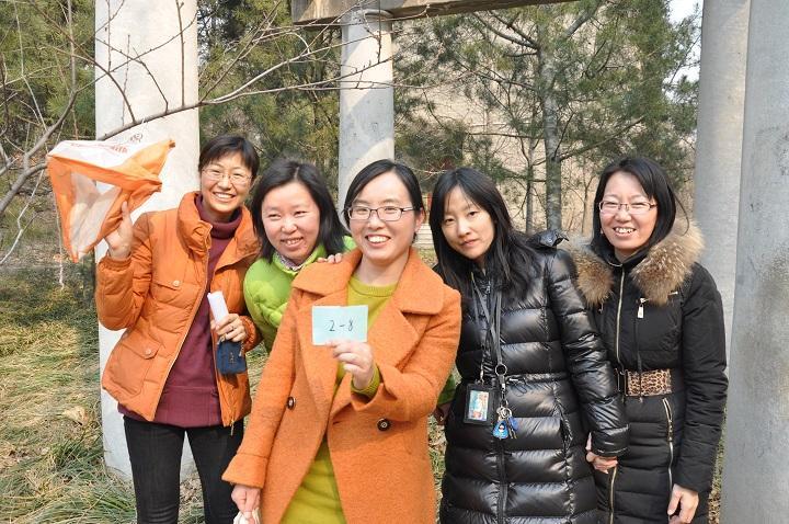 两队另辟蹊径,向地图上较偏远的东北点进发,一路果然畅通无阻。“找到啦――”随着一声欢呼,老师们在朗润园两栋住宅楼之间的自行车棚上果然发现了黄色标志旗。大家喜逐颜开,迅速上前合影“登记”。接着两队再原路返回,此时小亭已是人去亭空,第三个点也顺利拿下。