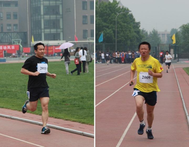 的刘勇老师与范辉军老师参加了男子C组1500米比赛。两位老师均为活跃在教学研究岗位一线的知名学者,但在工作之余也一直坚持运动锻炼。比赛中,两位老师分属两个小组。范老师首先登场,他采用了跟随跑的战术,稳健地完成了全程,取得小组第3。刘老师在第2组登场,他根据自身特点,开场就奋力争先,一度领先其他选手60米开外。但在最后一圈时体力不支被赶超,也获得小组第3。赛事间隙,两位老师就自己最终可能的总名次展开了严谨的学术探讨。最终刘老师和范老师以相近的计时成绩分居第5位和第6位。