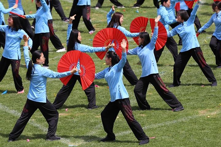 由于降雨影响,原定于4月21日上午举行的团体太极扇表演移至4月24日中午举行。当天艳阳高照,但数院教工斗志昂扬。位居舞台中心位置的他们身着天蓝色练功服装,精神抖擞地大步进入操场。在碧绿的草坪上,在柔美的音乐中,老师们将每个太极动作一气呵成地操练下来,将手中的红扇舞得行云流水、虎虎生风,为北京大学一百二十周年校庆献上了自己最出色的表演。