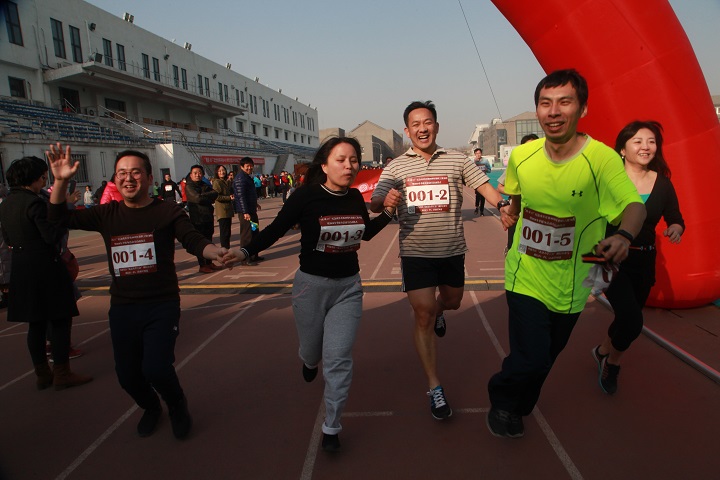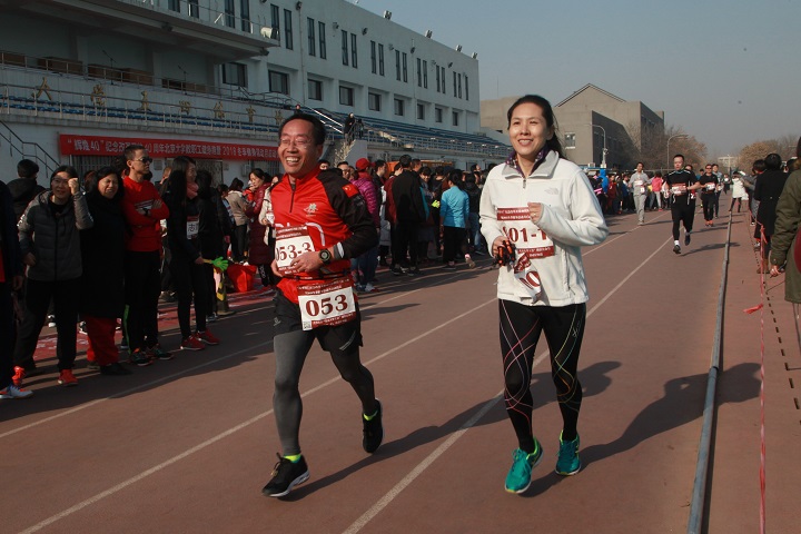 阳光明媚的初冬中午,大家集聚在五四田径场起跑线,年轻的心已是跃跃欲试。随着安钰峰副书记的一声发令枪响,郑老师一马当先冲了出去,为数学队开了一个好头。40圈的苦行是漫长的等待与意志的坚持。坚持日常锻炼、有跑步功底的范老师和冯老师成为了队伍的主力担当,分别承担了5公里以上的路程。大家相互加油鼓劲,及时交接棒次,每位队员都跑了两棒以上。田径场大屏幕的剩余圈数一点一点地滚动下降,大家的斗志也更加昂扬。最后4圈,在场的几位老师一人一圈,在终点处携手昂首集体冲线,漂亮地完成了全场比赛。