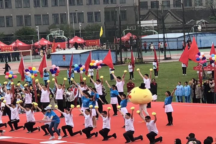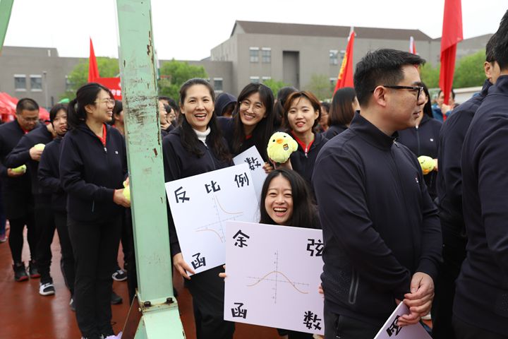 的男生整齐排成的坐标轴与女生形成的函数图像相映成趣。舞台中央可爱的吉祥物“识数鸡”,生动地展现了数学学子风采——独特,快乐,生动鲜活。老师们举着函数符号的牌子面向主席台,展现了他们用热情解析人生的形象。