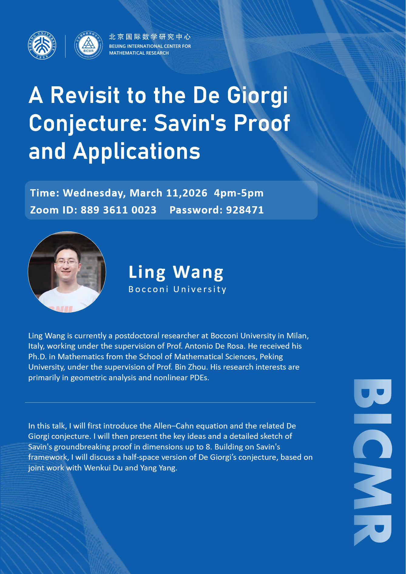 Ling Wang is currently a postdoctoral researcher at Bocconi University in Milan, Italy, working under the supervision of Prof. Antonio De Rosa. He received his Ph.D. in Mathematics from the School of Mathematical Sciences, Peking University, under the supervision of Prof. Bin Zhou. His research interests are primarily in geometric analysis and nonlinear PDEs.