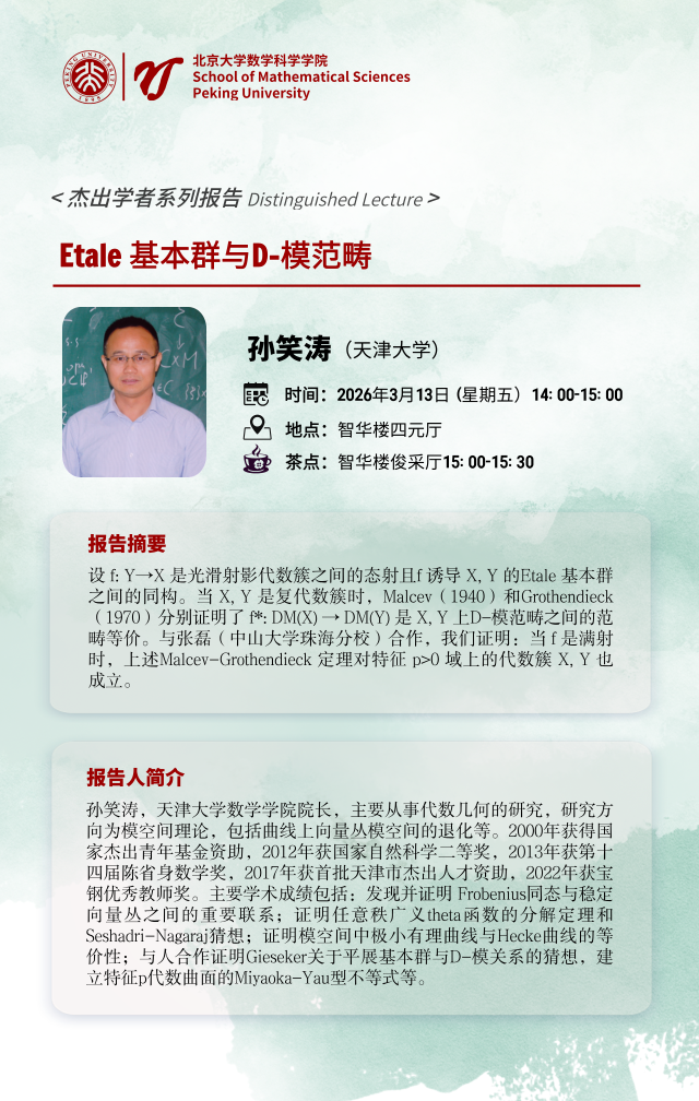 报告摘要:设 f: Y→X 是光滑射影代数簇之间的态射且f 诱导 X, Y 的Etale 基本群之间的同构。当 X, Y 是复代数簇时,Malcev(1940)和Grothendieck(1970)分别证明了 f*: DM(X) → DM(Y) 是 X, Y 上D-模范畴之间的范畴等价。与张磊(中山大学珠海分校)合作,我们证明:当 f 是满射时,上述Malcev-Grothendieck 定理对特征 p>0 域上的代数簇 X, Y 也成立。