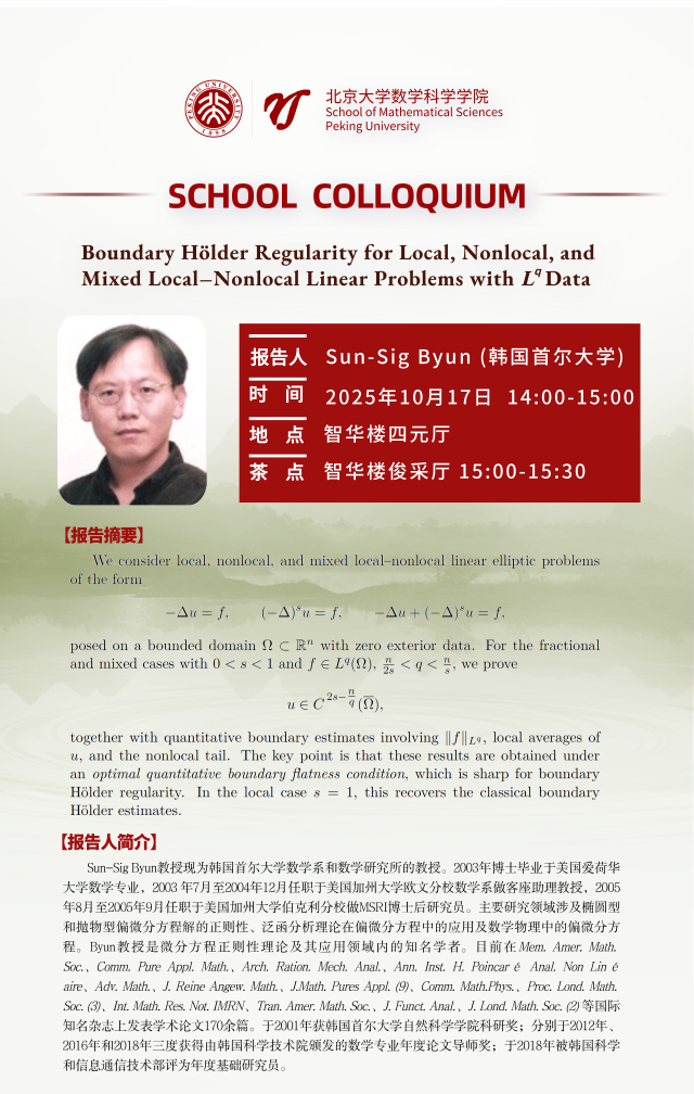 Sun-Sig Byun教授现为韩国首尔大学数学系和数学研究所的教授。2003年博士毕业于美国爱荷华大学数学专业,2003 年7月至2004年12月任职于美国加州大学欧文分校数学系做客座助理教授,2005年8月至2005年9月任职于美国加州大学伯克利分校做MSRI博士后研究员。主要研究领域涉及椭圆型和抛物型偏微分方程解的正则性、泛函分析理论在偏微分方程中的应用及数学物理中的偏微分方程。Byun教授是微分方程正则性理论及其应用领域内的知名学者。目前在Mem. Amer. Math. Soc.、Comm. Pure Appl. Math.、Arch. Ration. Mech. Anal.、Ann. Inst. H. Poincaré Anal. Non Linéaire、Adv. Math.、J. Reine Angew. Math.、J.Math. Pures Appl. (9)、Comm. Math.Phys.、Proc. Lond. Math. Soc. (3)、Int. Math. Res. Not. IMRN、Tran. Amer. Math. Soc.、J. Funct. Anal.、J. Lond. Math. Soc. (2) 等国际知名杂志上发表学术论文170余篇。于2001年获韩国首尔大学自然科学至尊国际