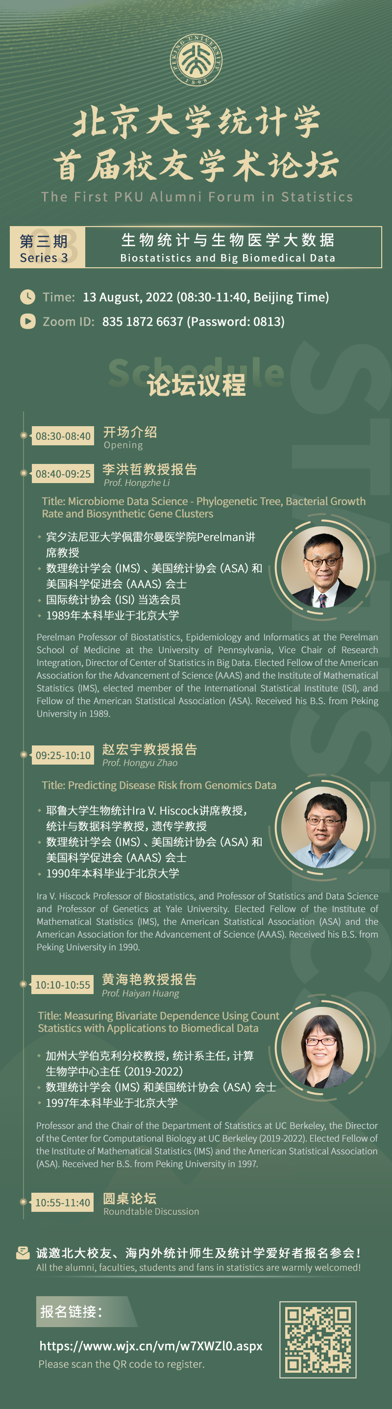 北京大学统计学首届校友学术论坛第三期将于北京时间2022年8月13日上午举行,主题是:“生物统计与生物医学大数据” (Biostatistics and Big Biomedical Data)。本期将邀请宾夕法尼亚大学李洪哲教授、耶鲁大学赵宏宇教授、 加州大学伯克利分校黄海艳教授三位校友作报告分享,之后进行圆桌讨论。根据疫情防控要求,本期论坛将继续采用Zoom线上会议形式进行。