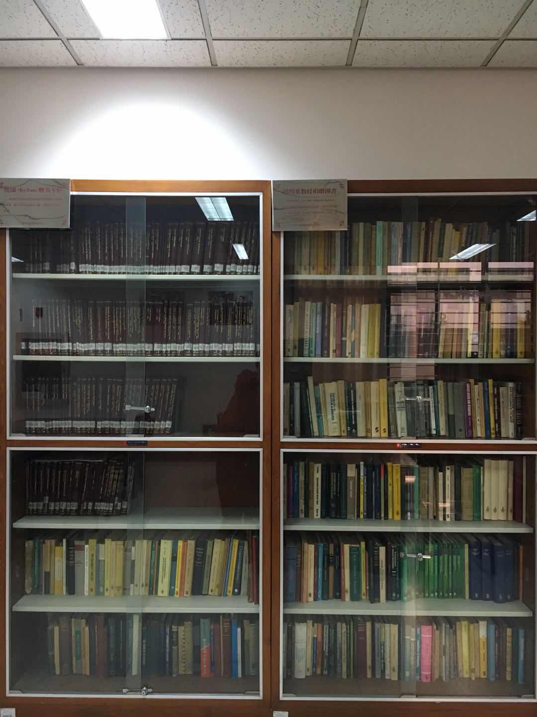 馆藏:现有纸版文献26000余册,外文期刊113种,中文期刊20种,学位论文近2000册,报纸20种。在馆藏图书中,外文原版图书所占比例达到80%以上, 是数学图书馆的馆藏特色。馆藏文献包括知名校友捐赠的数学专著,图书馆为此设立了专柜。数学图书馆迄今作为馆藏收藏的校友赠书超过2000种。下图为校友赠书专柜。