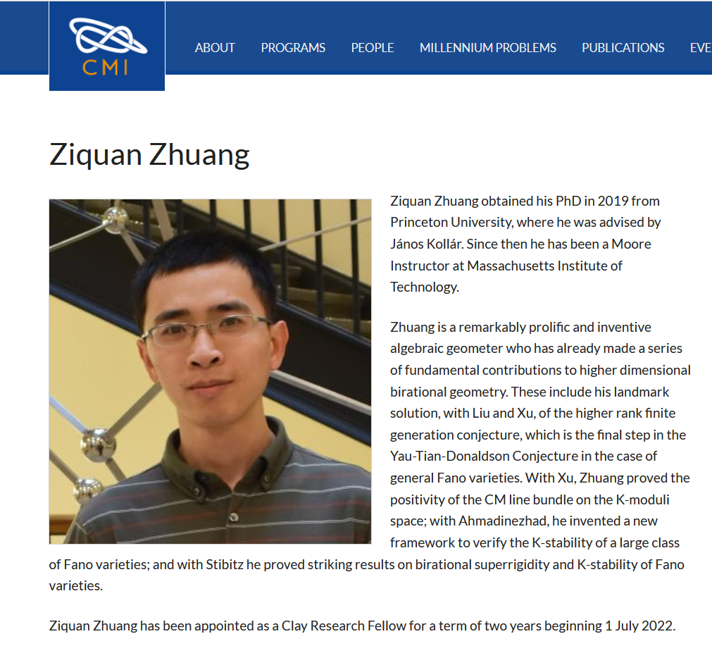 近日,克雷数学研究所(Clay Mathematics Institute,简称CMI)宣布,因庄梓铨在高维双有理几何方面做出了一系列重要贡献,特授予克雷研究学者职位(2022 Clay Research Fellows),任期从2022年7月1日正式开始,为期两年。