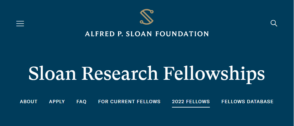 斯隆研究奖由艾尔弗·斯隆基金会(The Alfred P. Sloan Foundation)自1955年起每年颁发给数学、物理学和化学领域在职业早期的杰出青年学者,后来陆续增加了神经科学、经济学、计算机科学以及计算和进化分子生物学,一直以来有“诺奖风向标”的美誉。