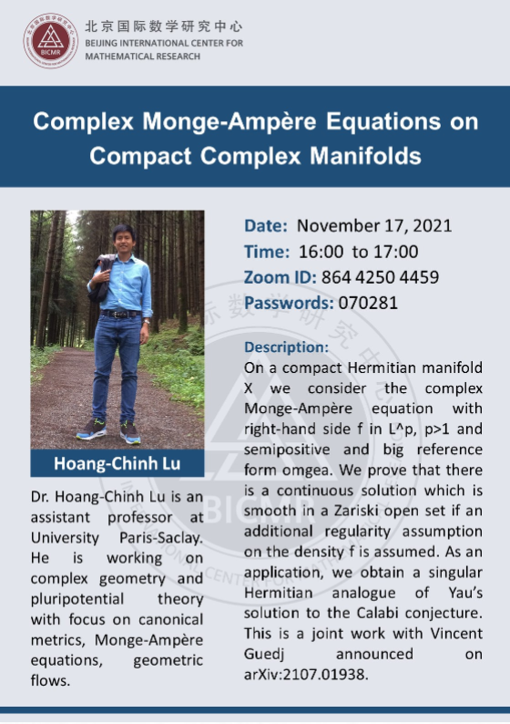 Dr. Hoang-Chinh Lu is an assistant professor at University Paris-Saclay. He is working on complex geometry and pluripotential theory with focus on canonical metrics, Monge-Ampère equations, geometric flows.