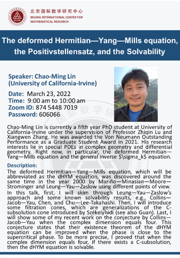 Chao-Ming Lin is currently a fifth year PhD student at University of California-Irvine under the supervision of Professor Zhiqin Lu and Xiangwen Zhang. He was awarded the Von Neumann Outstanding Performance as a Graduate Student Award in 2021. His research interests lie in special PDEs in complex geometry and differential geometry. Right now, in particular, the deformed Hermitian—Yang—Mills equation and the general inverse $\sigma_k$ equation. For more details about him, please visit: //www.math.uci.edu/~chaominl/.