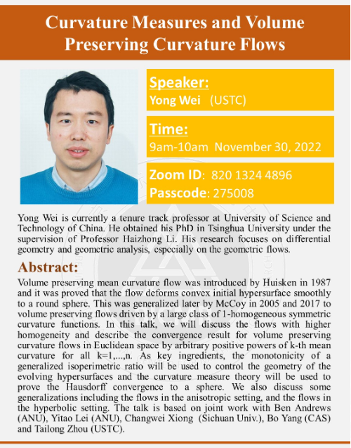Speaker: Yong Wei is currently a tenure track professor at University of Science and Technology of China. He obtained his PhD in Tsinghua University under the supervision of Professor Haizhong Li. His research focuses on differential geometry and geometric analysis, especially on the geometric flows.