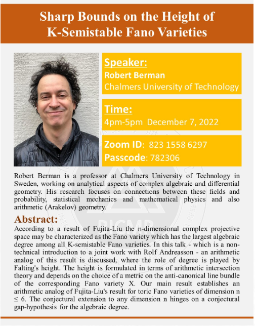 Abstract: According to a result of Fujita-Liu the n-dimensional complex projective space may be characterized as the Fano variety which has the largest algebraic degree among all K-semistable Fano varieties. In this talk - which is a non-technical introduction to a joint work with Rolf Andreasson - an arithmetic analog of this result is discussed, where the role of degree is played by Falting's height. The height is formulated in terms of arithmetic intersection theory and depends on the choice of a metric on the anti-canonical line bundle of the corresponding Fano variety X. Our main result establishes an arithmetic analog of Fujita-Liu's result for toric Fano varieties of dimension n ≤ 6. The conjectural extension to any dimension n hinges on a conjectural gap-hypothesis for the algebraic degree.