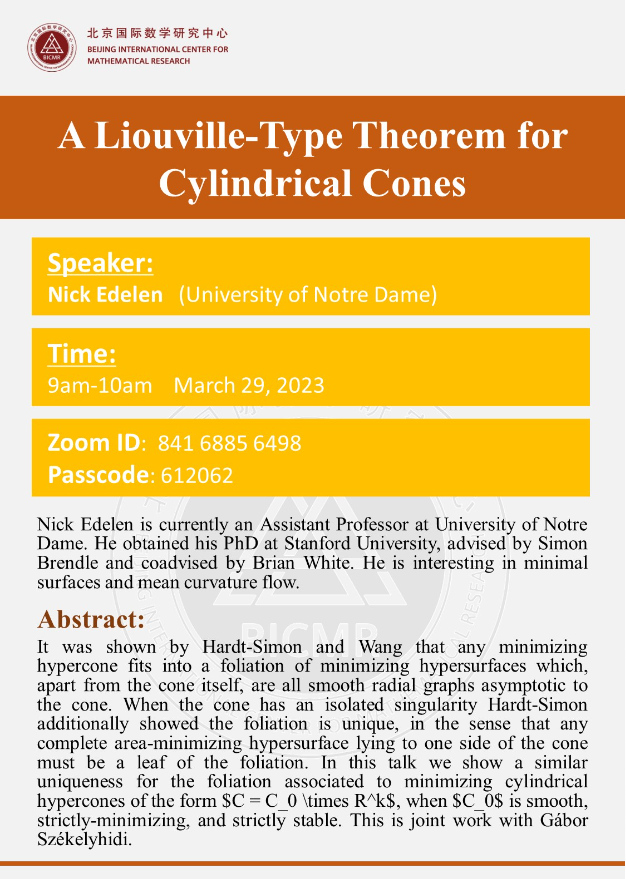 Speaker: Nick Edelen is currently an Assistant Professor at University of Notre Dame. He obtained his PhD at Stanford University, advised by Simon Brendle and coadvised by Brian White. He is interesting in minimal surfaces and mean curvature flow.