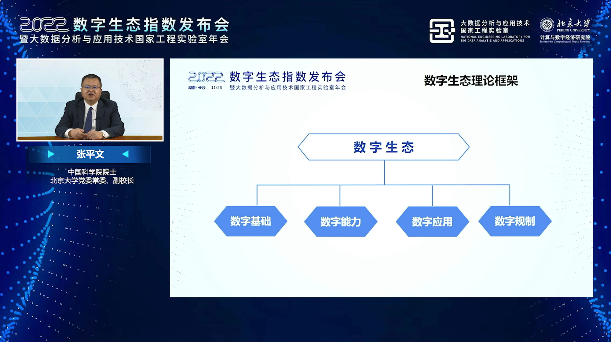 2022年11月26日,数字生态指数2022发布会暨大数据分析与应用技术国家工程实验室年会在线上成功举办,本次大会由北京大学大数据分析与应用技术国家工程实验室联合长沙市科学技术局、湖南湘江新区科技创新和产业促进局主办,北京大学计算与数字经济研究院承办。院士专家、政府领导、企业机构权威人士等重量级嘉宾汇聚云端、共襄盛举,共同见证《数字生态指数2022》发布。湖南省发展和改革委员会党组成员、副主任文会中,湖南湘江新区(长沙高新区)党工委委员、管委会副主任郭力夫为大会致辞,北京大学党委常委、副校长张平文院士,东北大学党委常委、副校长唐立新院士,中国电子信息产业集团有限公司党组成员、副总经理、总法律顾问陆志鹏等专家出席会议。会上,多项重磅报告发布,湖南算力网络融合协同创新平台正式启动,并特邀业界专家作主题报告,共创数字经济发展的美好前景。
