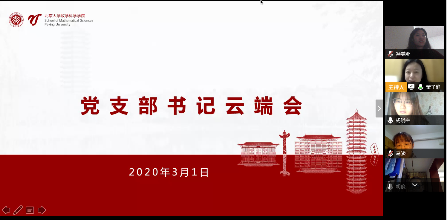 已面向党支书发送邮件,提示疫情防控期间的党建工作。董老师再度提醒同学们党员发展不断线、积极分子培养不放松,继续做好党员发展规划,越是战“疫”当前越考验信仰是否忠贞、意志是否坚定。保质保量开展好组织生活,通过组织生活会、主题党日等在疫情防控期间充分发挥基层党组织战斗堡垒作用和党员先锋模范作用。此外,董老师还提示了党支部年度材料检查、党建创新立项、党员自愿捐款等具体工作。