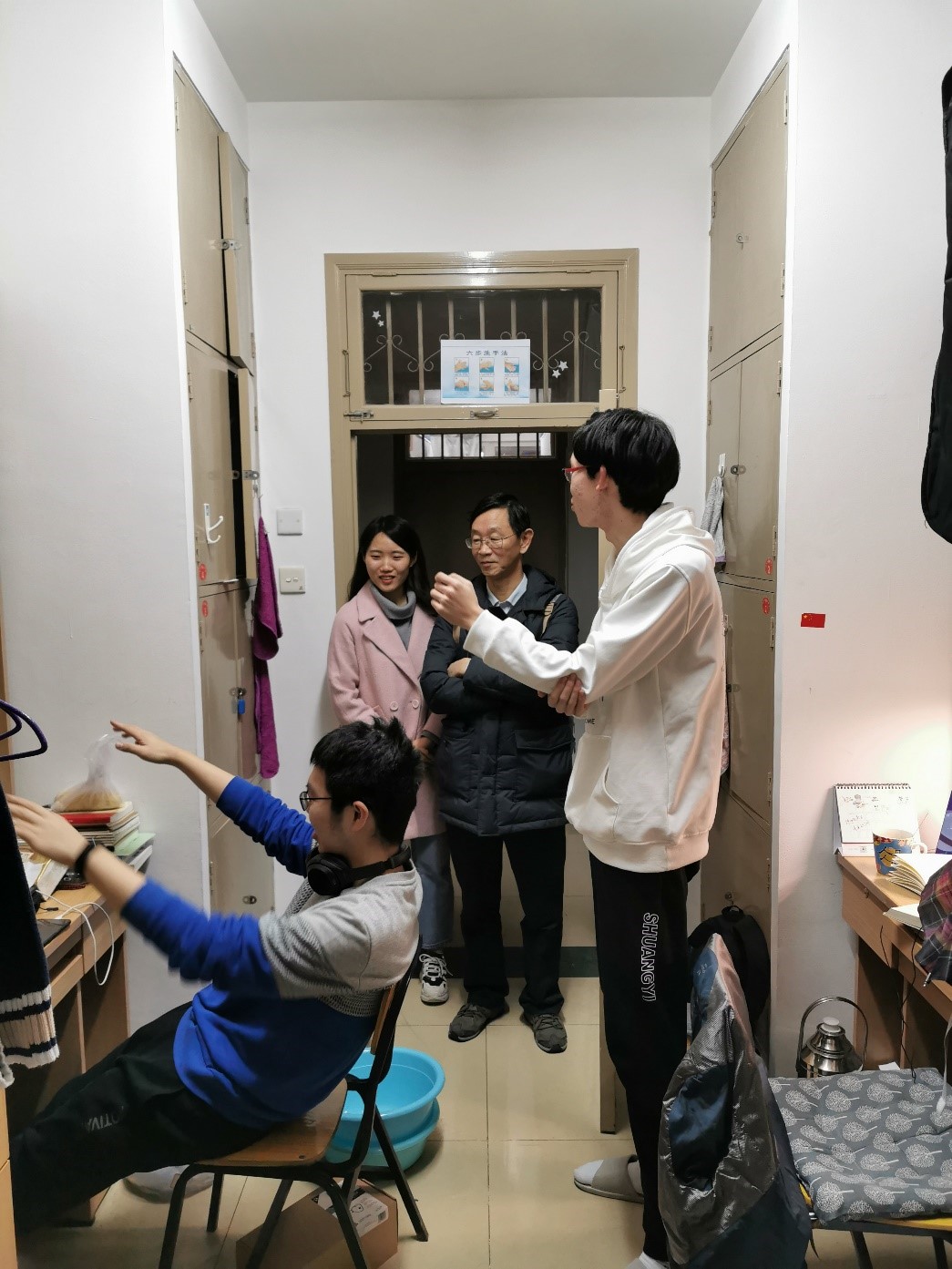 1月6日晚,针对37楼2019级本科男生呕吐、腹泻症状频发,2019级本科生5班第二班主任刘力平、院团委书记冯美娜、辅导员崔孟龙第四次走访19级本科生宿舍。本次宿舍走访涵盖三个要点:第一,检查宿舍卫生和通风情况,对环境卫生有所改观的宿舍予以表扬,要求卫生不达标的宿舍现场整改;第二,检查洗手方法掌握、洗手液使用情况;第三,检查同学面对呕吐、腹泻等情况的应急处理能力;第四,检查是否有出现呕吐、腹泻、发烧症状,但尚未就诊的同学,及时劝其前往就医。