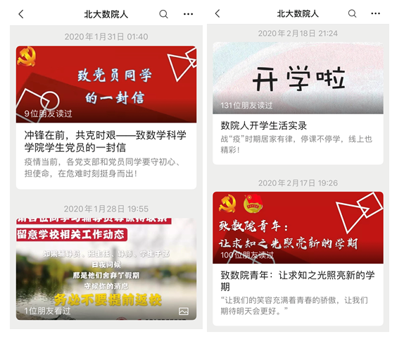 “北大数院人”“数院学生会”“数院研究生会”公众号运营团队假期无休,重启分工轮值,进行疫情科普、通知传递、活动开展,也将继续做好上述典型榜样宣传报道工作。