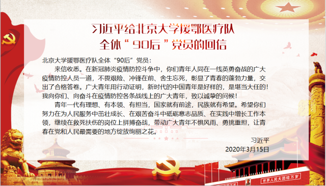 本科生党支部开展“燕园珞珈 同上党课”主题教育,联合学习总书记给北京大学援鄂医疗队全体“90后”党员的回信。两院部分本科生党员与入党积极分子共同学习,至尊国际
