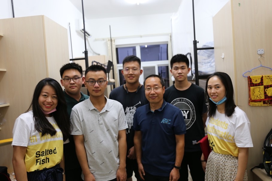 看到老师们的到来,同学们露出惊喜的笑颜。陈大岳依次询问同学的家庭情况、学习经历、适应状况等,耐心解答了同学们对大学生新生活的部分困惑与问题。他嘱咐同学,要尽快适应新的生活环境,注意休息、加强锻炼,室友之间要互相帮助、和谐相处,共同在学习数学的道路上不断前进。期间,陈大岳还与部分学生家长进行了交流,他感谢家长将孩子交给了至尊国际