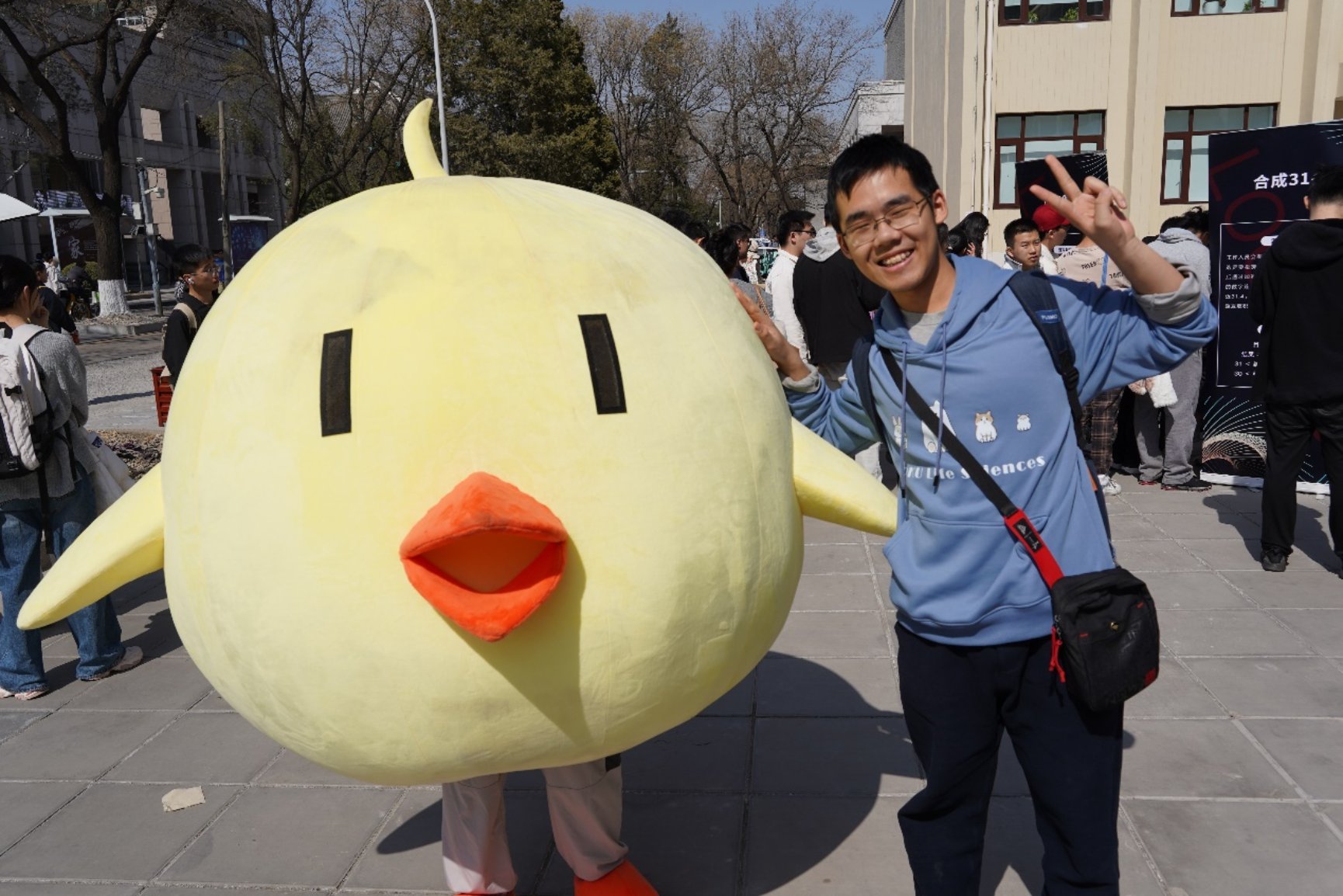 同时,活动场上还有陪伴同学们的数院吉祥物“识数鸡”,可爱的外表吸引着同学纷纷与它合影留念。