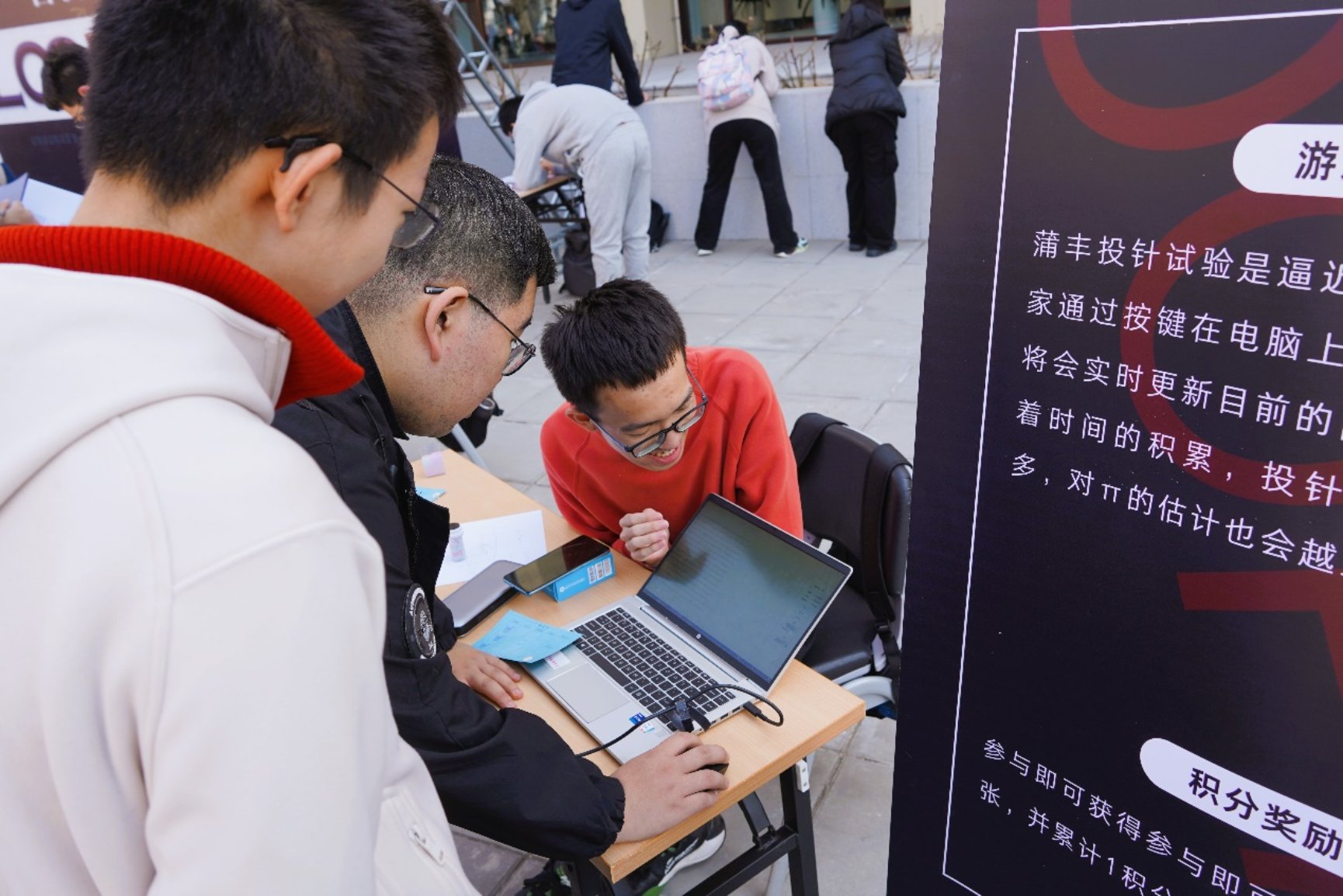 现场设置了“蒲丰投针”模拟实验和“π中找生日”的参与性小游戏,参与的师生还收获了记有生日所在π中位数的纪念书签和明信片。其中在“蒲丰投针”模拟实验中,经过上千位游玩者的累积投针,最佳估计达到了π小数点后六位。