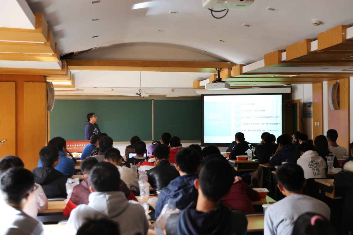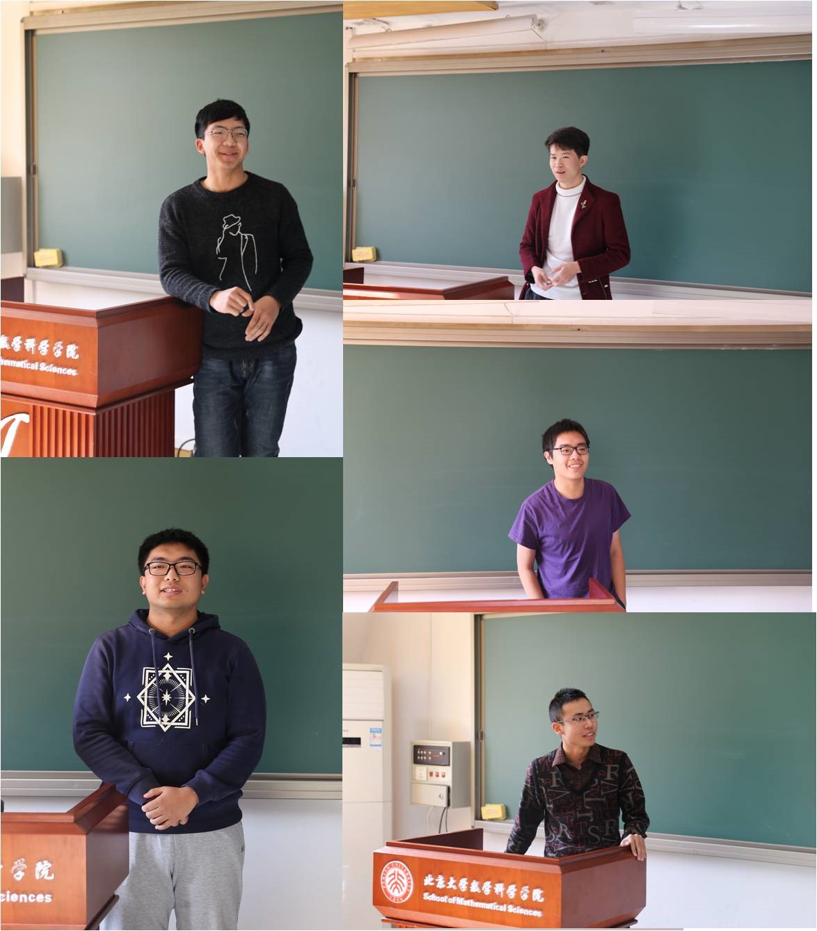 在牛贺老师的逐一介绍下,各位学长和同学们分享了自己大学的成长经历,并着重介绍了如何找到适合自己的发展方向并执着坚持。国家奖学金获得者、现已推免直博本院的赵朝熠同学分享了自己初入大学时给自己定的小目标“每学期加入一个新的学生组织”,这看似并“不专一”的小目标,其实是在鼓励同学们勇敢去尝试大学生活中的精彩。今年5月代表北大成功登顶珠峰的陶炳学用一张张绝美的照片带大家领略了登顶珠峰后的震撼,而作为其中年龄最小的队员,他也表示初入大学从未想象过会有这样一次人生体验。通过分享登山队日常训练的点滴,让我们看到了坚持的力量。全情投入学生工作的杨帅杰则为同学们讲述了他与数院学生会和街舞风雷社结缘的经历,他提到这两个组织是他在大学有最多“羁绊”的地方,也希望同学们在学成之际能在北大有所“羁绊”。作为数院难得一见的创业达人,戴正向同学们展示了他的创业项目,并将他了解的学校的创业资源分享给了大家。最后,“迷神”唐珑珂从自己的数学启蒙讲到他在大学与合唱结缘的故事,在解答同学们困惑的同时引导大家找到适合自己的学习方法。
