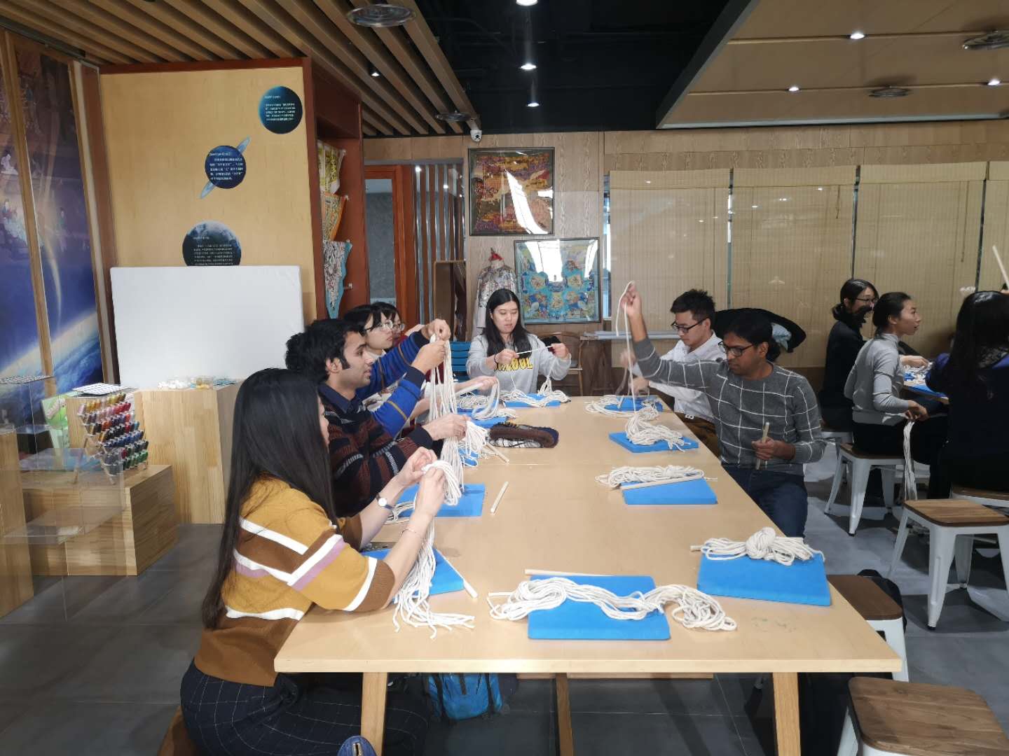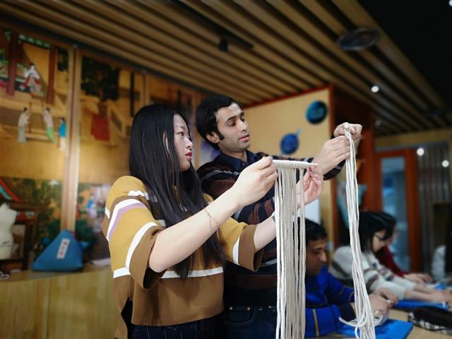 董老师老师为巴基斯坦留学生哈米德讲解编结方法