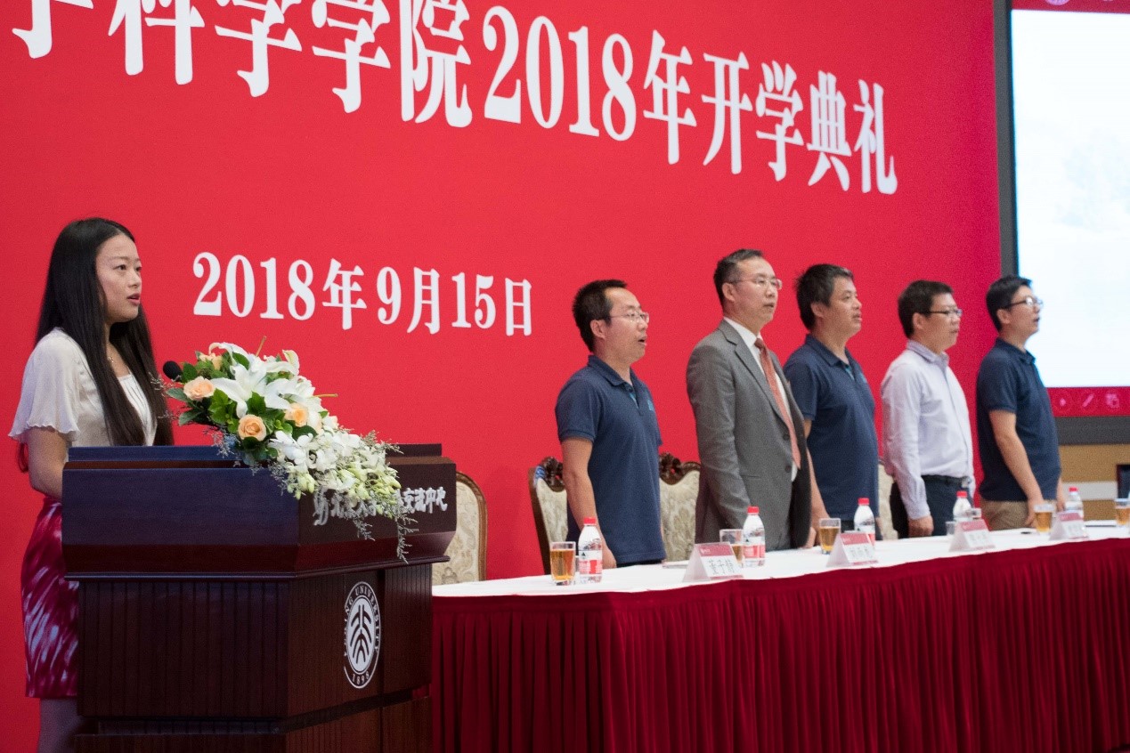 典礼开始前,2018级新同学在英杰交流中心门前留下入学合影,将与未来的毕业合影遥相呼应,组成数院人的成长映像。此前迎新、报到、军训等不同阶段的2018级新生影像也在屏幕上滚动播放,显示新同学初入燕园的足迹。在雄壮的国歌声中,开学典礼正式拉开帷幕。
