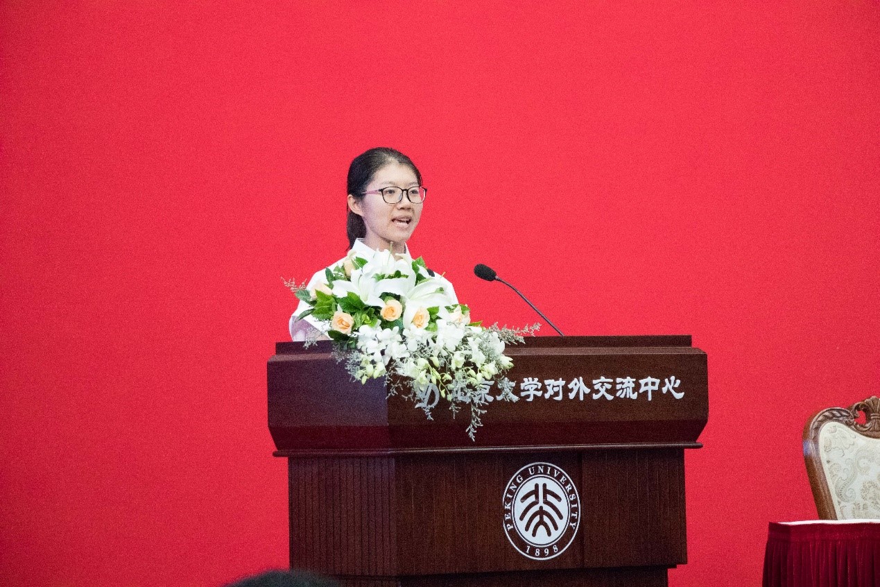 2018级本科生王艺纯、博士生刘子愉,分别作为本科生和研究生新生代表发言。王艺纯在发言中回顾了她与北大结缘的渊源,从神往北大的游客到参加数学与科学至尊国际