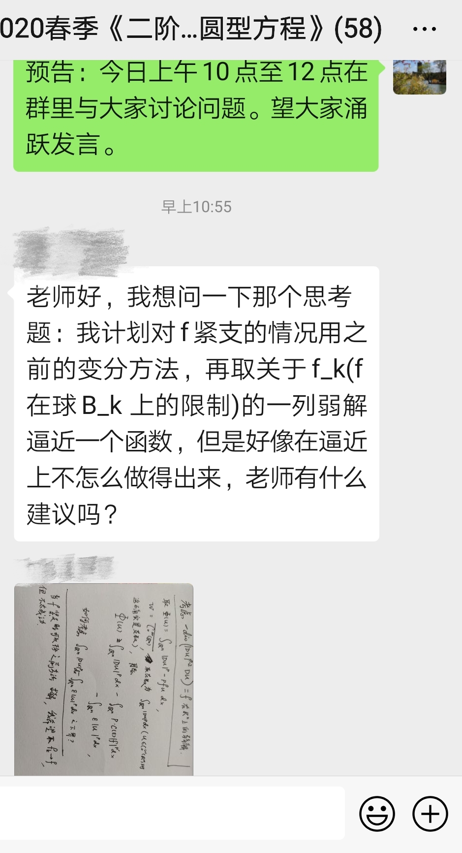 刚接到线上教学任务时的数院老师们,面临着各种现实困难,例如线上教学平台操作不熟悉、家中网络卡顿、没有手写公式的设备、录课时经常录到孩子的声音或是猫的声音等等。但是很快,老师们开始群策群力解决遇到的各种问题,他们利用微信群讨论与分享各种线上教学经验,他们试讲测试,深夜忙碌备战,根据线上授课特点重新整理教案,从种类繁多的新技术中挑选适合的,实现不同平台空间优势互补,创造云端教学拟态环境,以期为学生们带去更好的课堂体验。这段日子他们的微信群中,经常就一个教学问题讨论至深夜,他们从选择哪种技术到如何录屏,从如何书写板书到如何播放PPT,再到如何下载校园中的上下课铃声,以最大限度保持在线课堂的仪式感。他们八仙过海各显神通,用认真、严谨的态度,积极交流、相互促进、大胆实践,在一路升级打怪后,保障了全院132门课程如期上线,将数学知识传播给祖国各地的同学们。