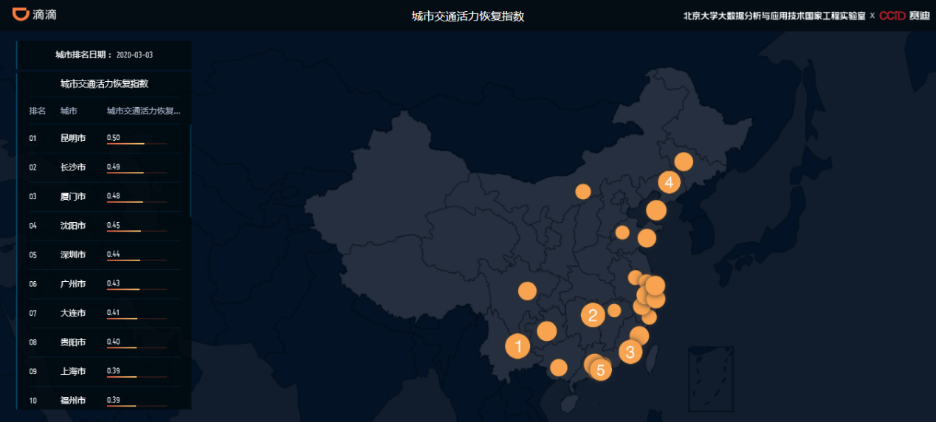 正常状况下,2019年底城市交通活力接近于1,随着城市生产生活逐步恢复,城市交通活力也将逐渐恢复至正常水平。考虑到湖北多地依旧实施机动车限行,因此并未将湖北省内城市纳入统计。这一城市交通活力恢复指数即日起也将对外开放,点击//sts.didichuxing.com/t-activity-index/即可查看城市交通活力恢复指数详情。