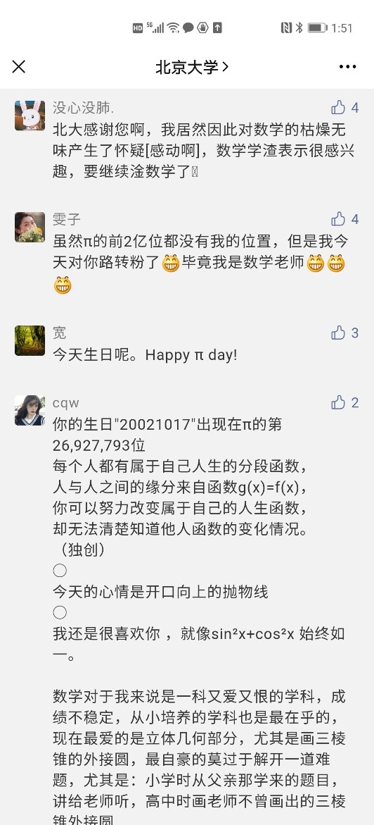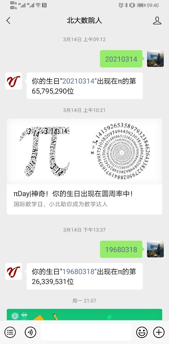 “你的生日,π记得。”本次活动在线上线下同步推出了“生日与π”小游戏,参与者可以在微信公众号“北大数院人”后台输入自己的生日,查找其在圆周率的第几位,当日后台互动留言超过2100万条,与北京大学官方微信平台合作的推文在3小时内阅读量超过10万次,粉丝们热情分享,后台留言爆满。
