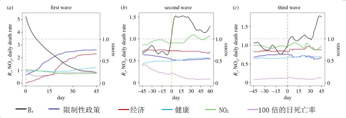 图1 经历了第一、二、三波疫情的国家从疫情社区传播日期(DCT)的第0天、前45天、前45天开始到DCT后45日的平均估计Rt与政策应对指数曲线。左坐标轴为各国的平均Rt、NO2指数及死亡率(乘100);右坐标轴为同时期的平均相对(除以最大值得到的标准化后的)政策应对指数,包括限制性政策、经济援助政策、公共卫生支持政策。