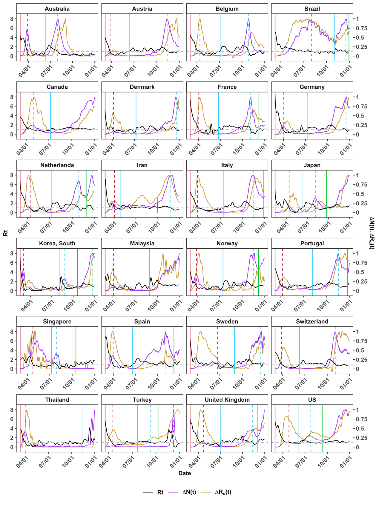 图2 24国估计Rt曲线(黑),每日新增死亡人数△Rd(t)(黄)(按最大新增比例折算)与每日新增病例△N(t)(紫)(按最大新增比例折算),红、蓝、绿色竖实(虚)线分别代表第一、二、三波疫情的开始(结束)时间。灰色横线为Rt = 1关键横线。