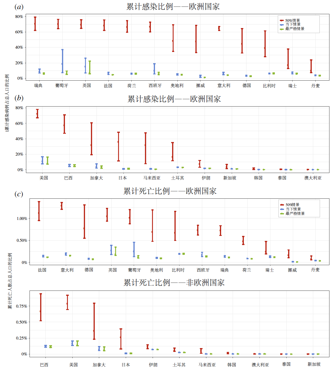 图5 欧洲十三国(a)(c)与非欧洲十一国(b)(d)预计人群感染病例比率与死亡病例比率及其95%置信区间(基于截止2020年12月31日数据)蓝色代表当下情景(2020年12月31日实际情景),绿色代表最严格管控情景,红色代表50%情景。有症状感染传播率取为0.8。