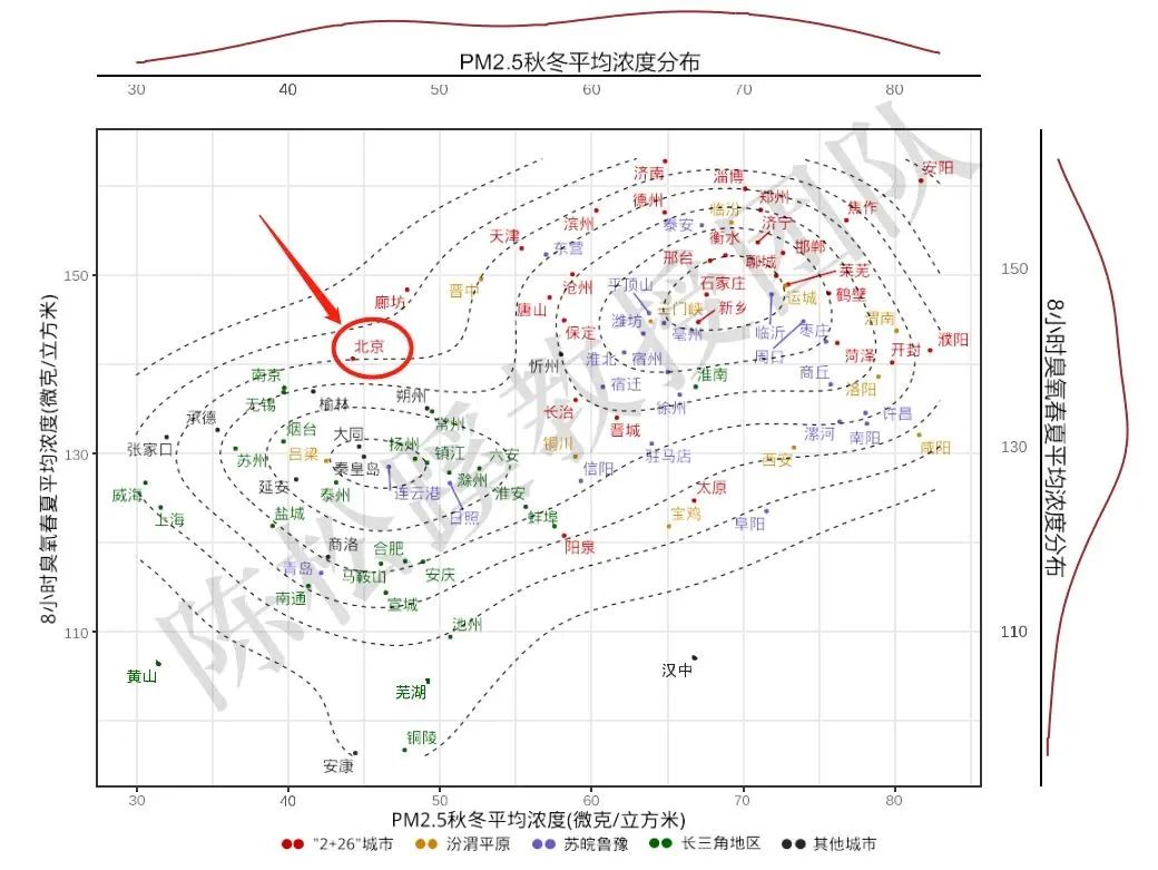 北大空气质量报告截图:“3+95”城市2020年PM2.5秋冬和8小时臭氧春夏平均浓度散点分布图