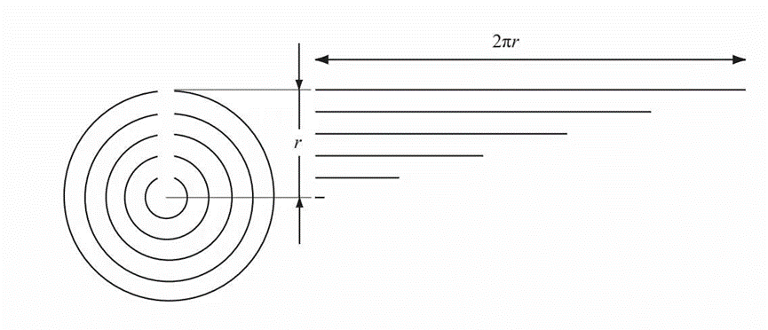 根据诸如爱因斯坦等专家的观点,常数π在对宇宙的描述中是一个关键数字。通过π,就可以在圆与非圆之间确立一种基本的关系。如下图,通过简单的观察就可以看出,圆的周长与直径之间的比值是一个常数,当直径增加时(直径等于半径r的两倍),它与圆周长长度的增加成正比。
