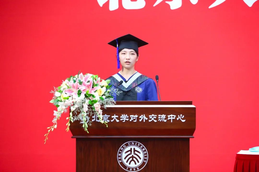 毕业生代表、2020级硕士研究生李婉箐上台发言。她感念燕园的一草一木,回忆起入学、上课、招生、建党百年重大活动、北京冬奥会等难忘经历,感谢北大的包容和赤诚,带着师长的谆谆教诲,勇敢踏上未来征途。