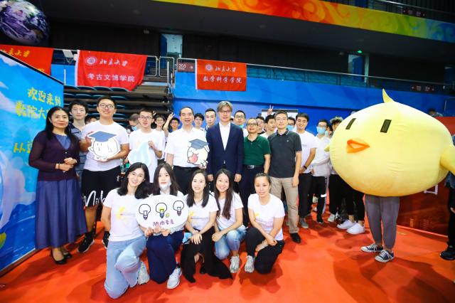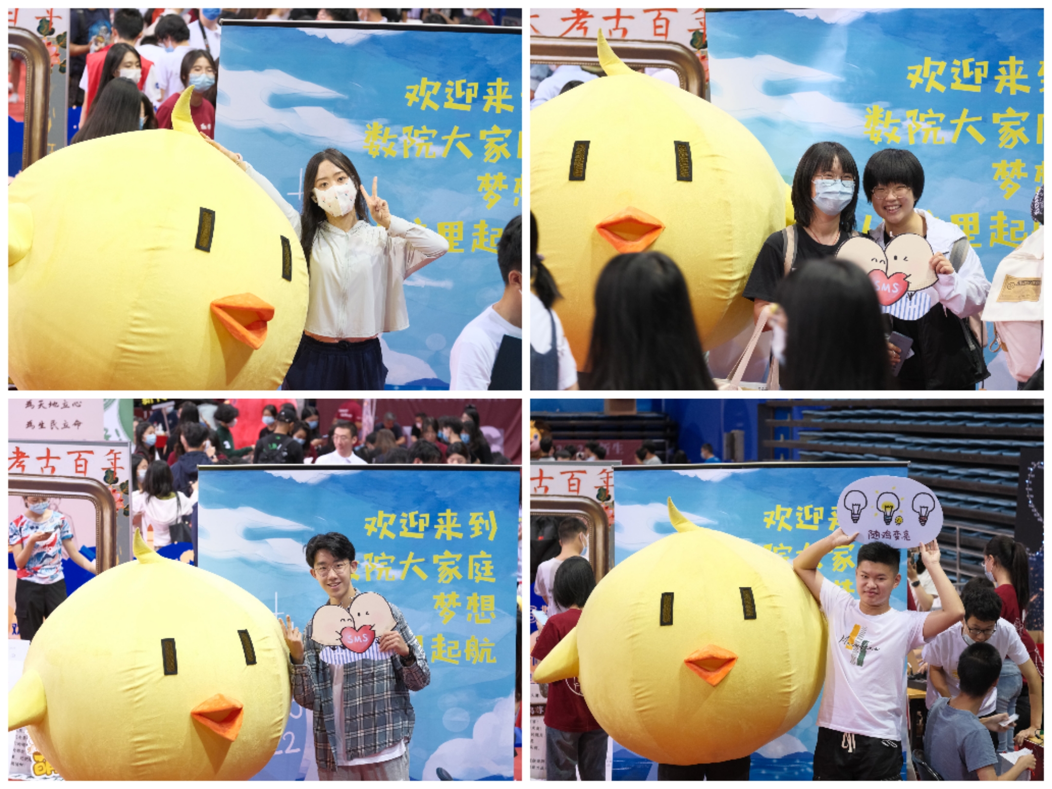 标志,和吉祥物“识数鸡”开心合影,留下了在燕园的首次记忆。