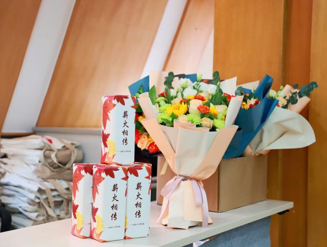 领导为从教三十年的教师赠送纪念品,共同品尝带有“薪火相传”字样的蛋糕,一起纪念这个重要的日子。