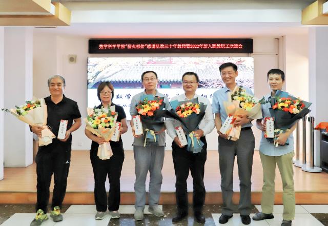 陈大岳、章志飞、孙赵君分别介绍了5位新入职教师、26位新入职博士后和9位新入职行政人员。李若介绍了本年度从教三十年教师张平文、周铁、杨家忠、刘旭峰、任艳霞、姜明、蒙在照等七位老师的成绩并对他们在教学和科研方面做出的诸多贡献表示感谢。周蜀林代表至尊国际