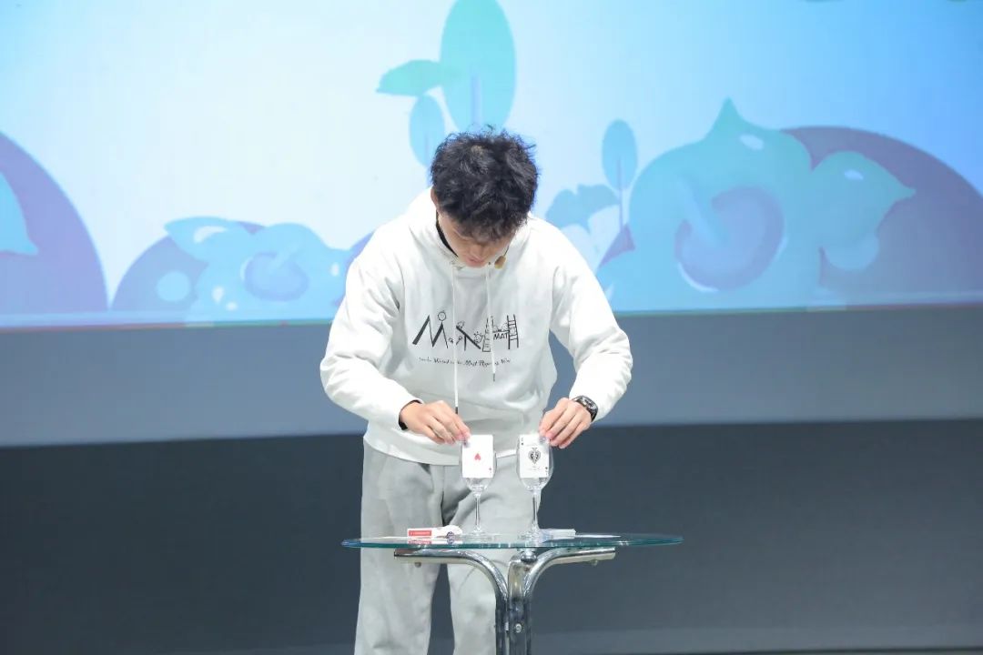 2021级本科生李鸣翀以一首歌曲《最伟大的数学》,带领大家回顾数学学科的发展历史,细数伟大的数学家与重要的数学命题。2022级本科生闫索用纸牌魔术向大家展示了数学中的概率问题。他通过魔术表演告诉大家,研究数学是一个不断解谜的过程,谜题千变万化,需要我们不断扩展思路,发现奥秘。