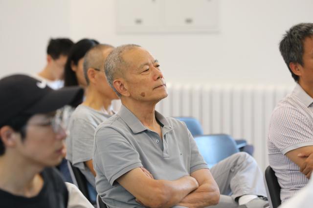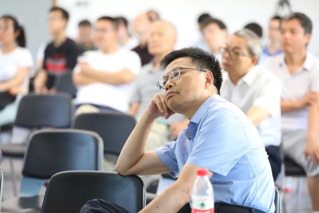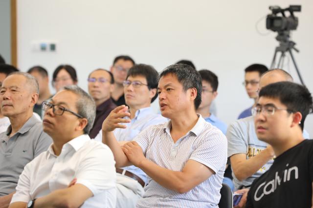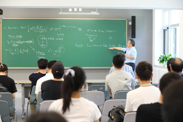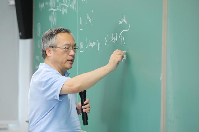 活动特别邀请南开大学张伟平院士作四元厅的首场学术报告。章志飞为黑板揭下塑膜并宣布报告开始。田刚院士、王诗宬院士、鄂维南院士及数院近百名师生参加了学术报告。