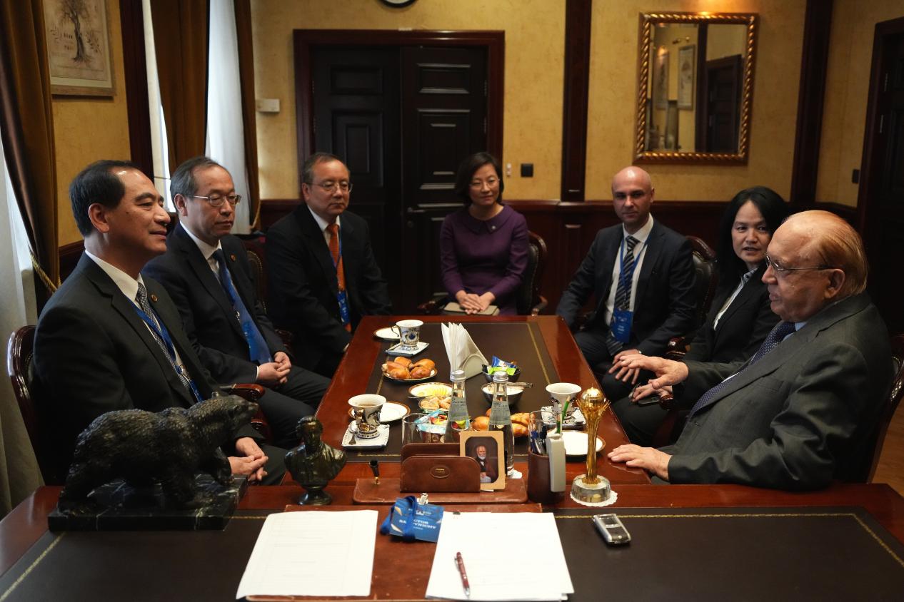 4月17日,代表团一行访问莫斯科国立大学,会见维克多·安东诺维奇·萨多夫尼奇(Victor Antonovich SADOVNICHY)校长,双方围绕两校进一步在基础科学等领域开展多维度交流合作进行探讨。龚旗煌表示,莫斯科国立大学是北京大学在俄罗斯最重要的合作伙伴,双方友好合作历史悠久,近年来通过中俄数学中心、中俄综合性大学联盟等平台,促进两国教育、科技、人才全方位合作,为中俄友好事业持续注入活力。萨多夫尼齐回忆了与北京大学近40年的深厚友谊,欢迎龚旗煌一行到访莫斯科,希望双方进一步加强往来,在现有合作基础上,进一步扩大并深化合作领域。